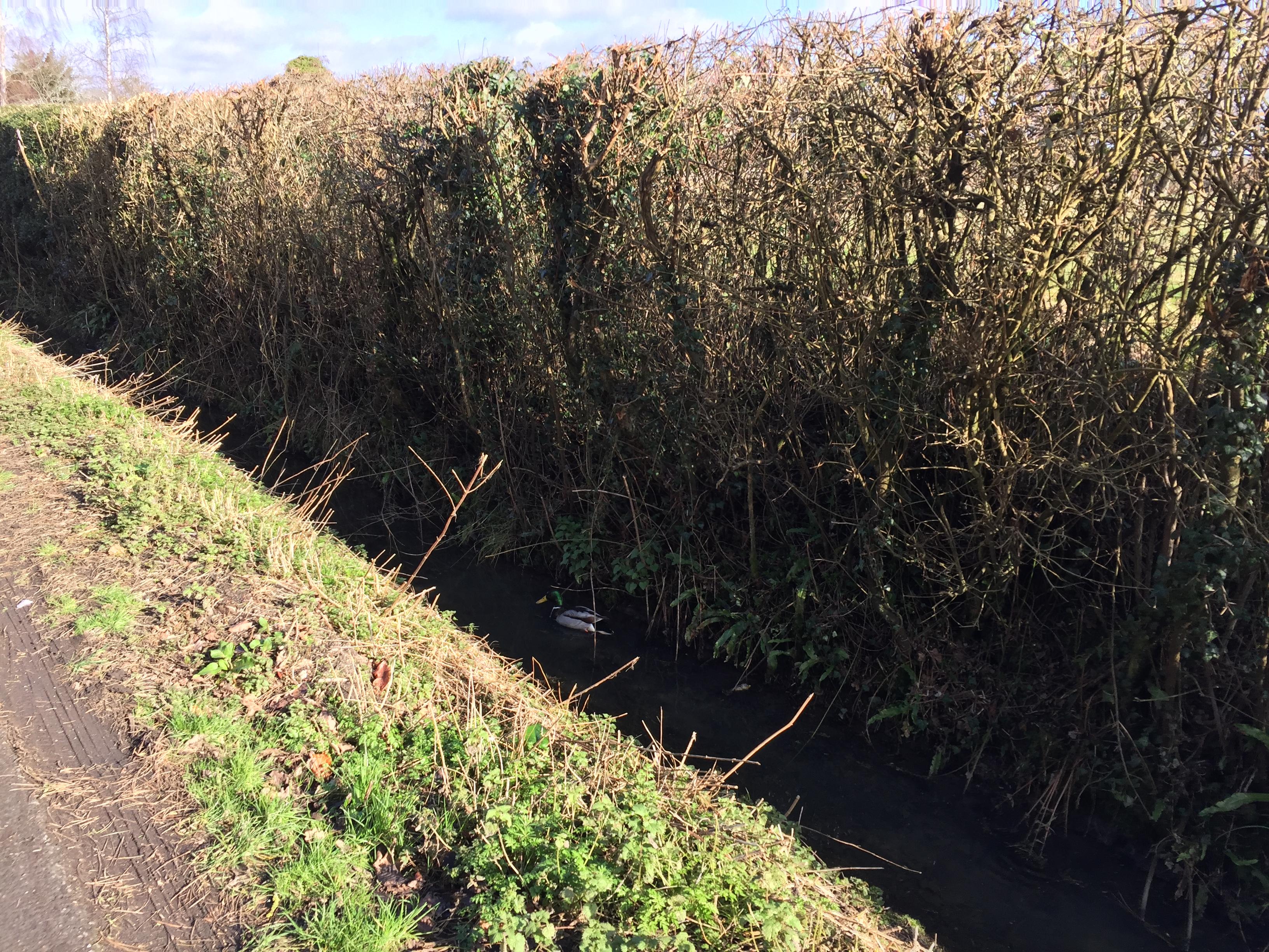though - a duck swimming in the ditch along the lane between 63 Hurst Barns